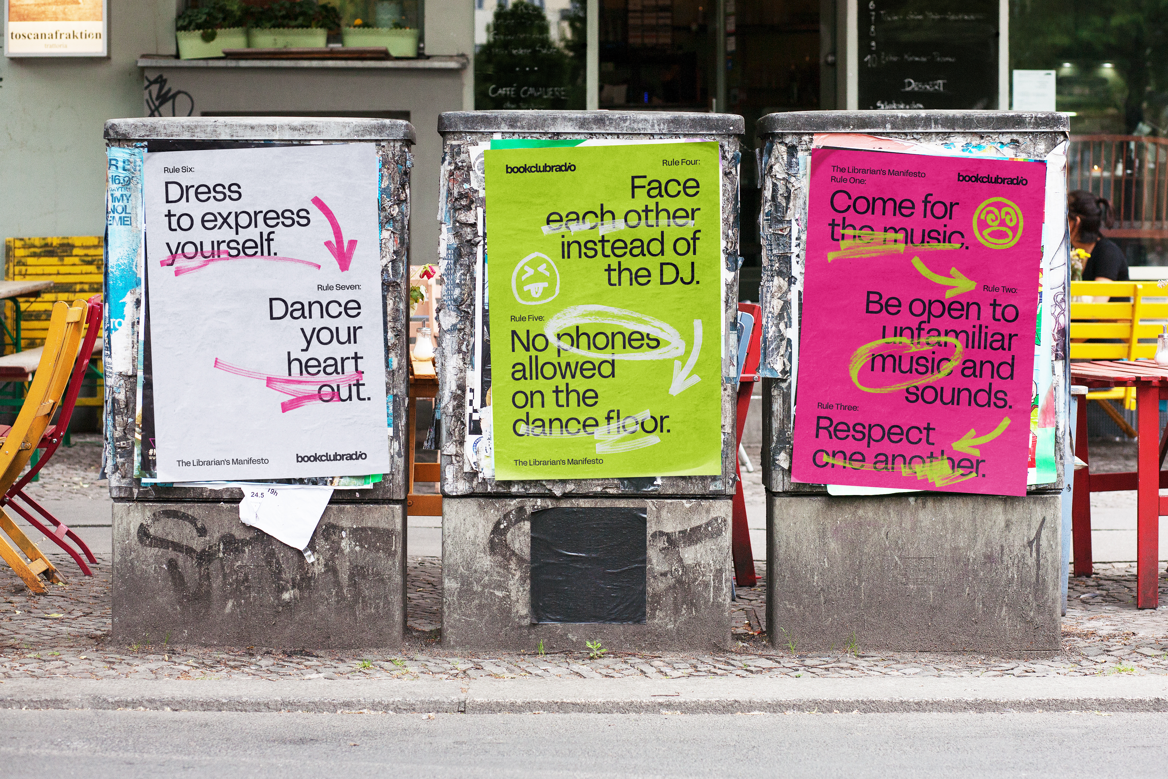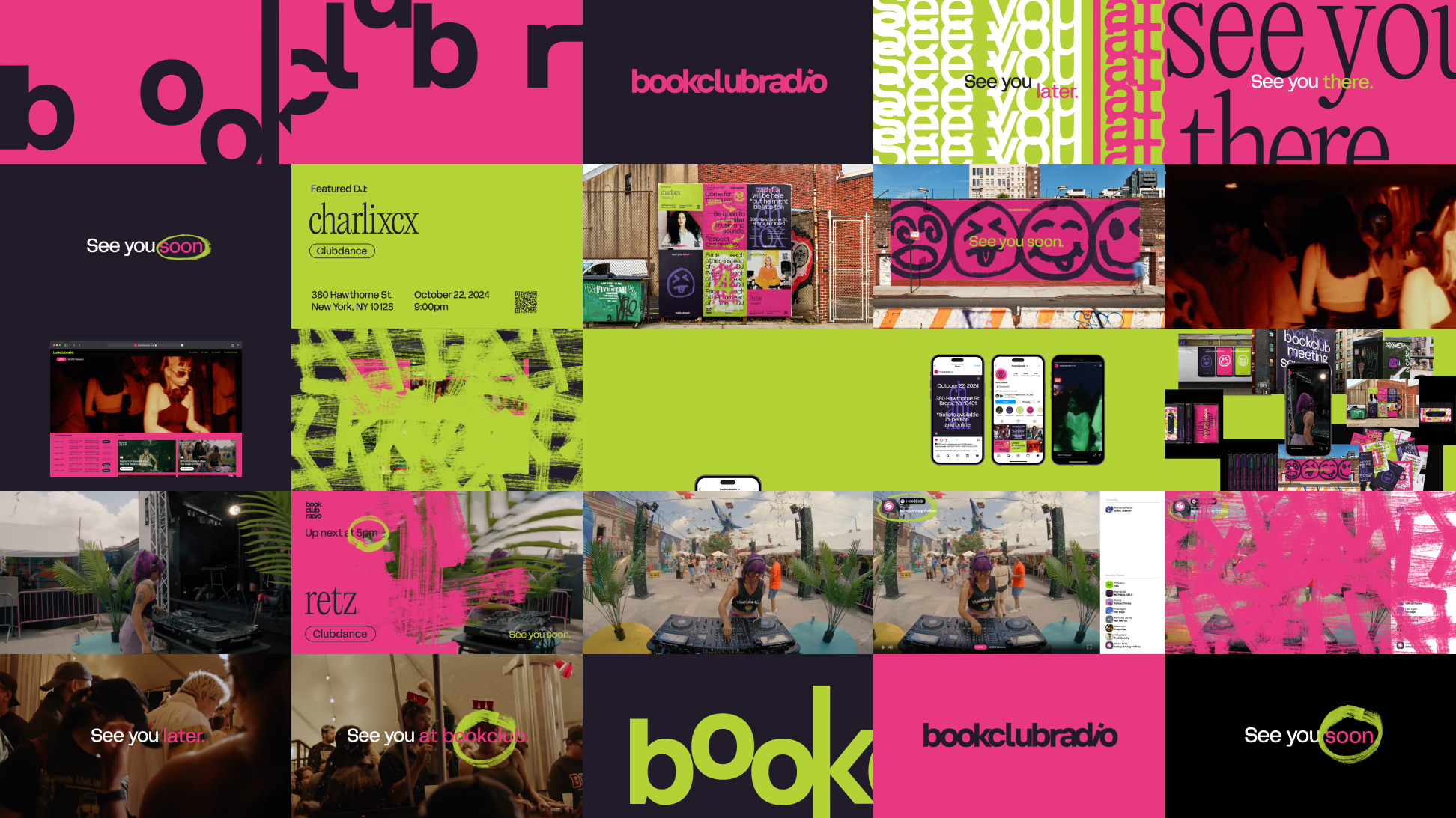 A dynamic and energetic new identity for Book Club Radio that embodies the energy and excitement of their pop-up dance club events, seamlessly capturing the vibrancy and spirit of their parties.