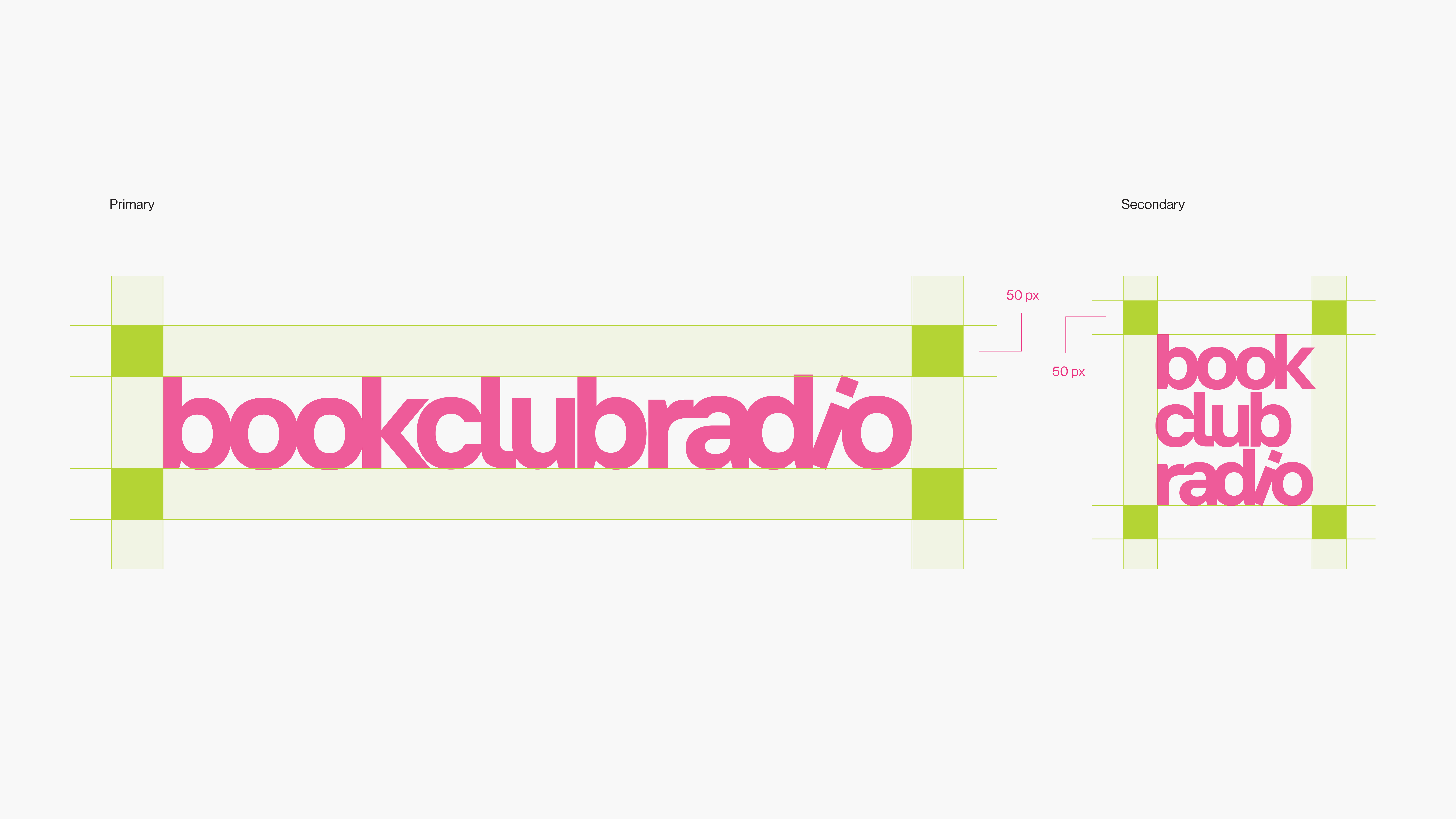 The Book Club Radio logo features a tilted, tightly kerned logotype to reflect the high-energy, intimate vibe of their events. The close spacing symbolizes the sense of connection within crowded spaces.