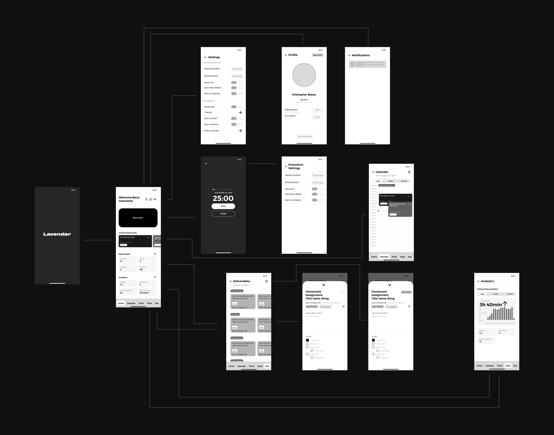 Through researching user habits, I found that many people are reluctant to record their work, as it feels like an extra layer of friction that gets in the way of actually getting things done. This core insight heavily influenced the information architecture and wireframe design for Lavender. The design prioritizes immediacy and minimal effort. The goal was to reduce the number of steps required to start a timer, ensuring that users can begin a session with the fewest possible taps. Given the variables involved in a user simply opening their phone, I made the key features of the app accessible directly from the home screen upon launch.